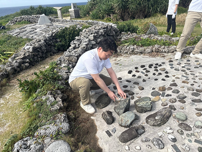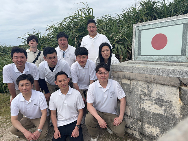 日本最南端の有人島、波照間島にて「波照間の碑」、「聖寿奉祝の碑」視察並びに清掃活動を行うため、北方会長以下22名の有志が沖縄県石垣島に集結した。当日、まさかの悪天候により高速船が欠航し、残念ながら渡島は叶いませんでしたが、石垣島にて、関連施設である「大濱信泉記念館」、「八重山平和記念館」を見学し、当時に思いを馳せ、見識を深めることとなりました。 |